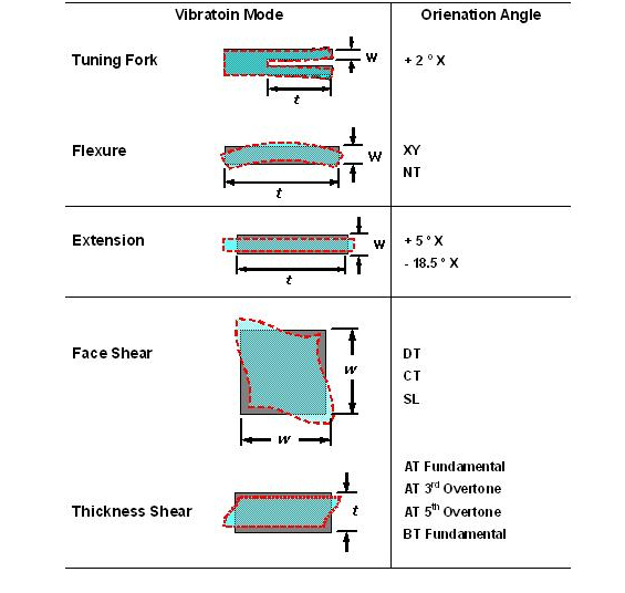 經(jīng)由不同的石英切割角度及不同電極型狀的電場效應(yīng), 石英芯片展現(xiàn)了各種不同的振動模態(tài). 以經(jīng)常產(chǎn)生的振動模態(tài)可以概分為擾曲模態(tài), 伸縮模態(tài), 面剪切模態(tài)和 厚度剪切模態(tài). 這幾種振動模態(tài)以簡單的方法在表一中可以看到. 在實(shí)際狀況中, 石英芯片并不是一定祇有單一種振動模態(tài), 而可能有多種模態(tài)同時存在在一個石英芯片的振蕩中, 經(jīng)由適當(dāng)?shù)脑O(shè)計, 可以壓制其它不希望產(chǎn)生的振動模態(tài), 來達(dá)到主要振動模態(tài)的最佳化..jpg)